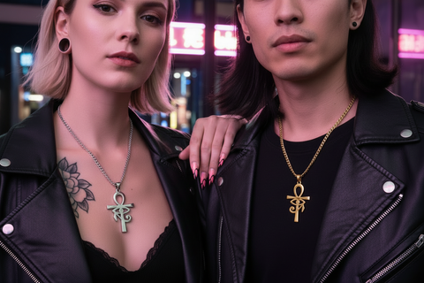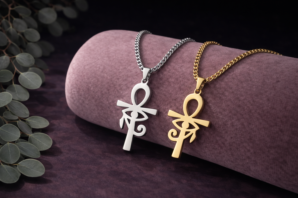 La croix Ankh — symbole de vie et de continuité — rencontre l’Œil d’Horus, associé à la protection et à la lucidité.